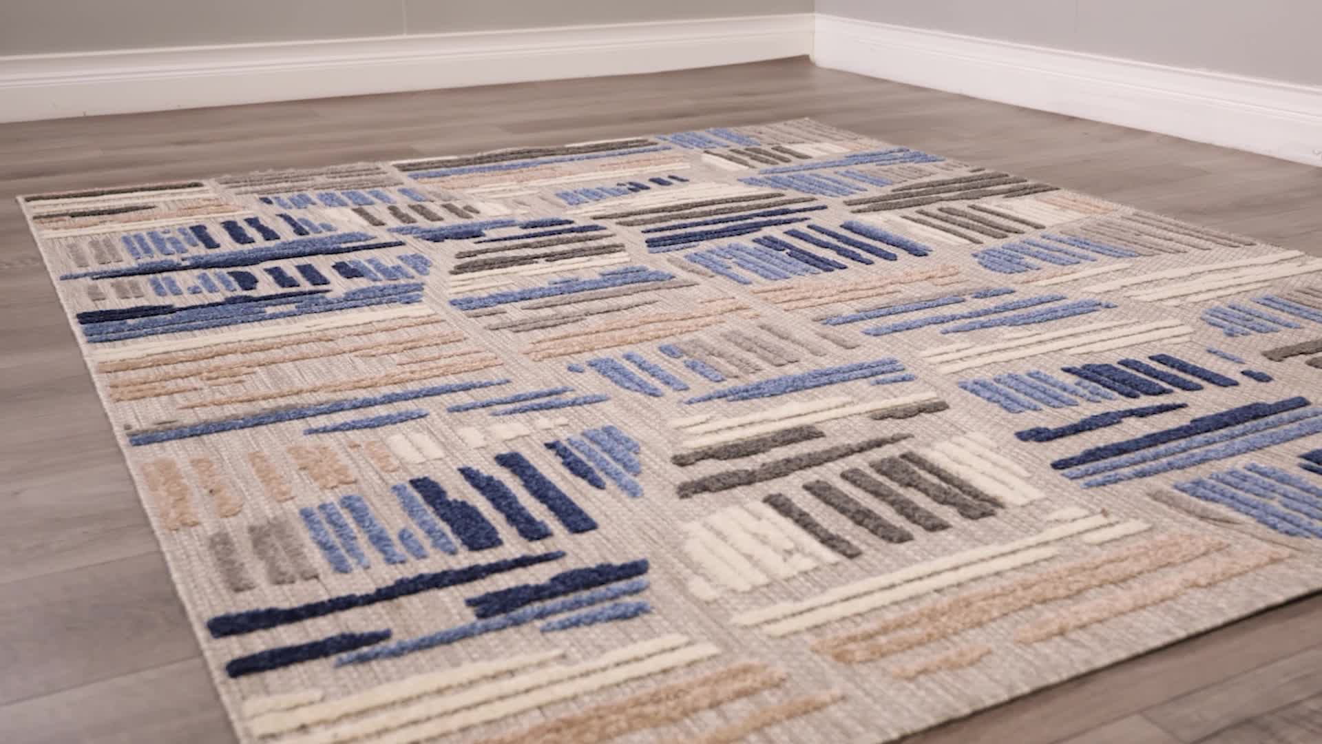 Exceptional durability meets modern abstract design in this versatile area rug, making it the perfect piece to upgrade your patio, kitchen, or sunroom. A versatile, contemporary palette of navy blue, sapphire, slate gray, charcoal, and ivory works seamlessly with a wide range of home decor styles, adding a touch of modern luxury to your indoor or outdoor space. The unique high-low weaving technique creates compelling depth and dimension, adding an extra element of compliment-worthy style to your home. Because these pieces are long-lasting and easy to clean, you can enjoy your favorite space without fear of staining or fading, even in the most high-traffic or spill-prone areas of your home. Each rug is machine made using state-of-the-art, computer-driven looms, and polypropylene yarns create a low profile pile that’s stain resistant and fade resistant. Delight in a modern combination of rich color, surprising comfort, and exceptional durability that fits both your home and your lifestyle effortlessly. For indoor or outdoor use. Imported.