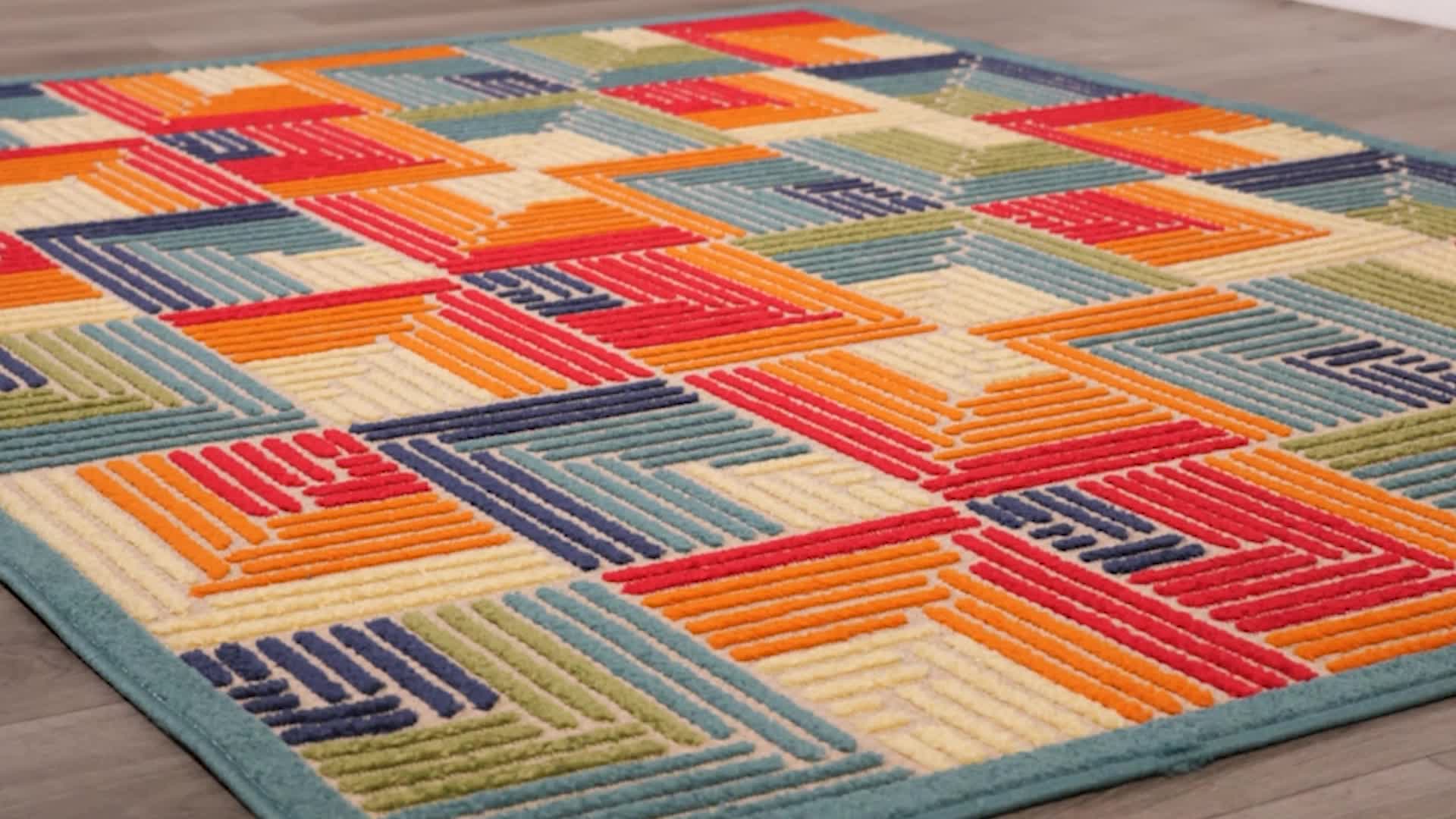 Add depth and dimension to your kitchen, garden, or patio with this beautifully designed and exceptionally durable area rug. Abstract geometric designs in tones of navy blue, sapphire, taupe, charcoal gray, and ivory create a brilliant multidimensional look, and the unique high-low weaving technique adds compelling texture. Whether it’s a quiet spot in the shade or a busy central dining area, this floor covering lets you infuse a bit of low maintenance, high-end design into your home without fear of staining or fading, even in high-traffic and spill-prone areas. These gorgeous floor coverings are fade resistant, stain resistant, and surprisingly comfortable underfoot thanks to soft polypropylene yarns, so you can spend more time enjoying your space and less time on maintenance. Easy to clean and machine made using state-of-the-art, computer-driven looms, these rugs are sure to maintain their exceptional durability and rich design for years to come. For indoor or outdoor use. Imported.