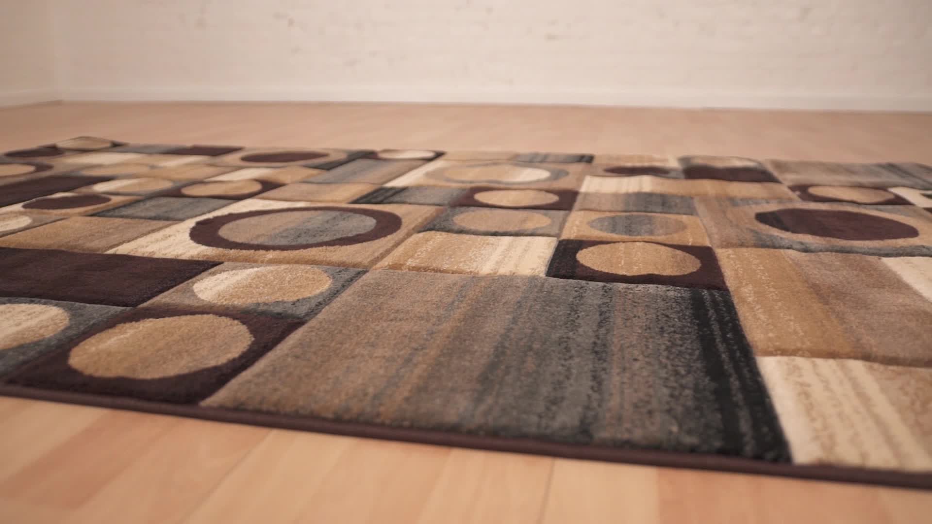 Add an extra dimension to your home decor with this stunning hand carved area rug. This rug features a pattern of different sized patches and circles in varying tones of slate gray, deep chocolate brown, off white, and cream to create an on-trend design that will elevate the look of your bedroom, home office, or dining room with a touch of modern luxury. The polypropylene pile of this rug is soft and luxurious, and each design is hand-carved for added depth and texture. Perfect for a wide range of decor styles, this beautifully woven area rug will do well in any area of your home - even places with high traffic and spill risk. In addition to being easy to clean, the stain resistant and fade resistant properties of this piece ensure that it will maintain its rich color, exceptional design, and soft underfoot feel for years to come. For indoor use. Imported.