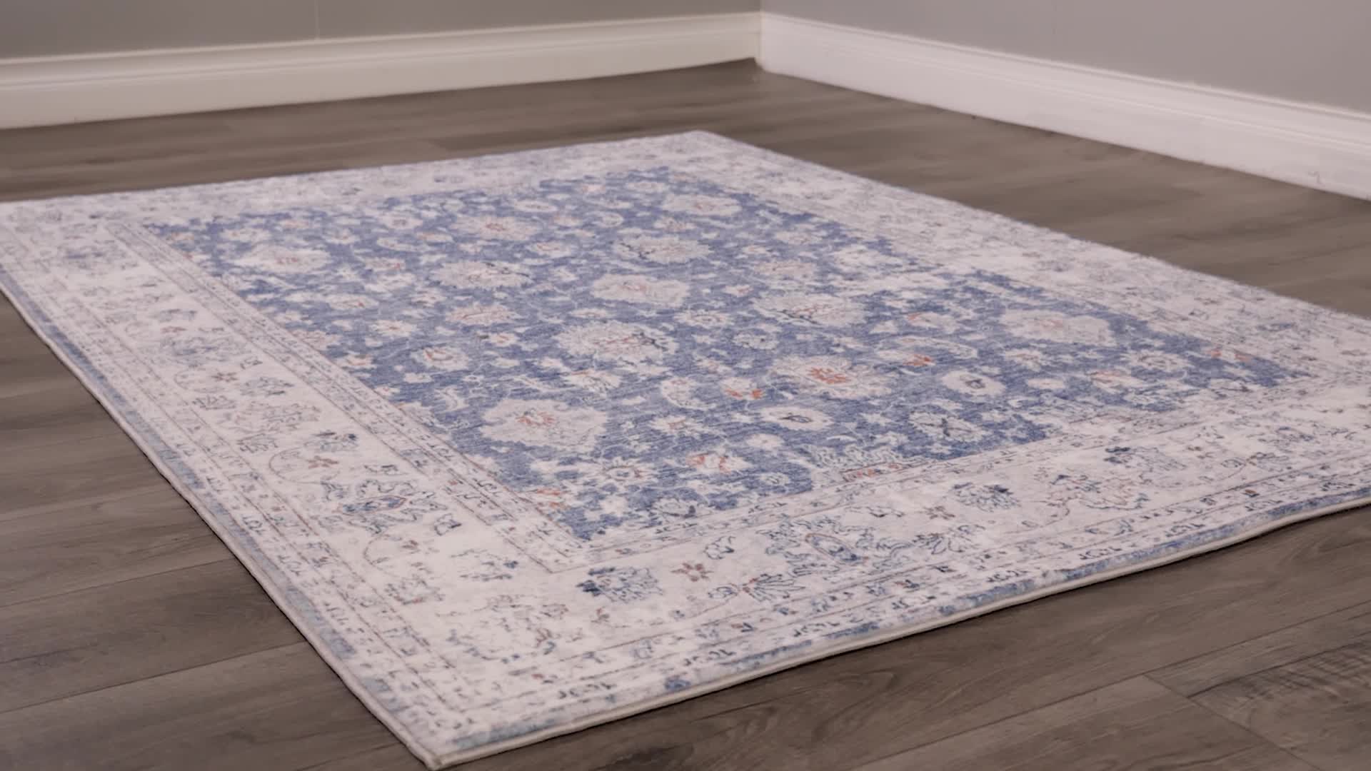 Pairing traditional design with fashionable distressing, the simple sophistication this beautiful border rug adds a touch of elegance to any room. Intricate designs with coral accents wind through an ivory border surrounding a cobalt blue center, creating a welcoming and stylish foundation for your living room, home office, or dining area. Enjoy the exceptionally crisp details and rich colors throughout, this area rug, machine-made with an eye-catching digitally printed design and touch-worthy 100% polyester faux fur. Even in busy homes with pets, children, or frequent visitors, the stain-resistant and fade-resistant properties of this rug allow it to shine in any area of your home. With a thick cotton canvas backing for added stability, this unique piece. is able to meet the needs of a modern household, in both style and durability. Bring a touch of modern luxury to even the busiest areas of your home, and enjoy the high-end design and irresistible softness underfoot for years to come.